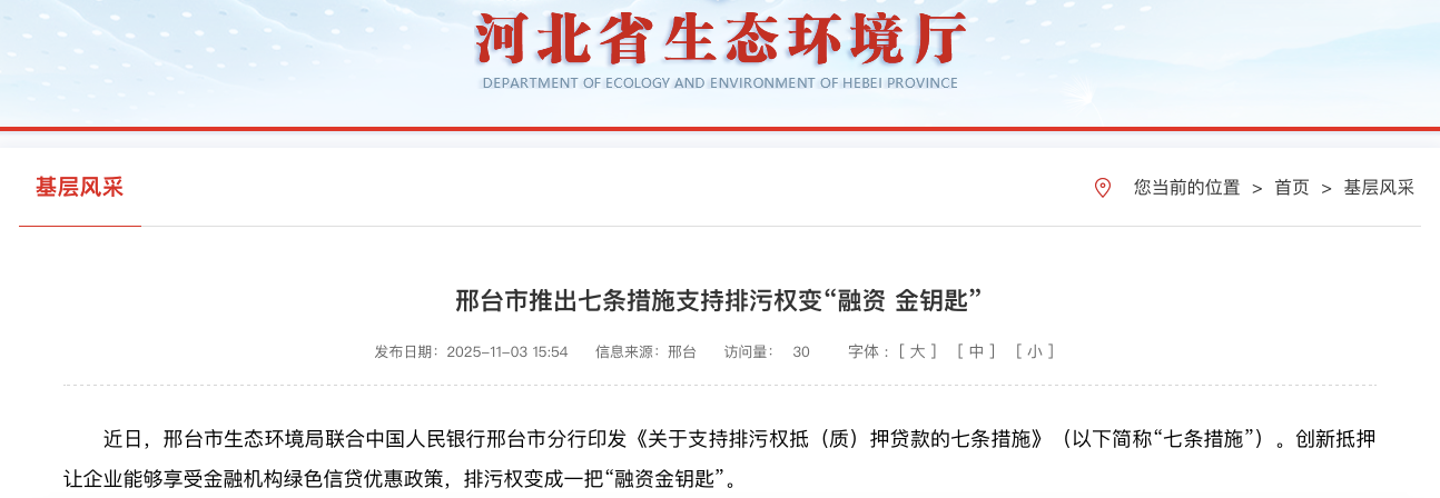 据河北省生态环境厅官网,近日,邢台市生态环境局联合中国人民银行邢台市分行印发《关于支持排污权抵(质)押贷款的七条措施》(以下简称“七条措施”)。创新抵押让企业能够享受金融机构绿色信贷优惠政策,排污权变成一把“融资金钥匙”。